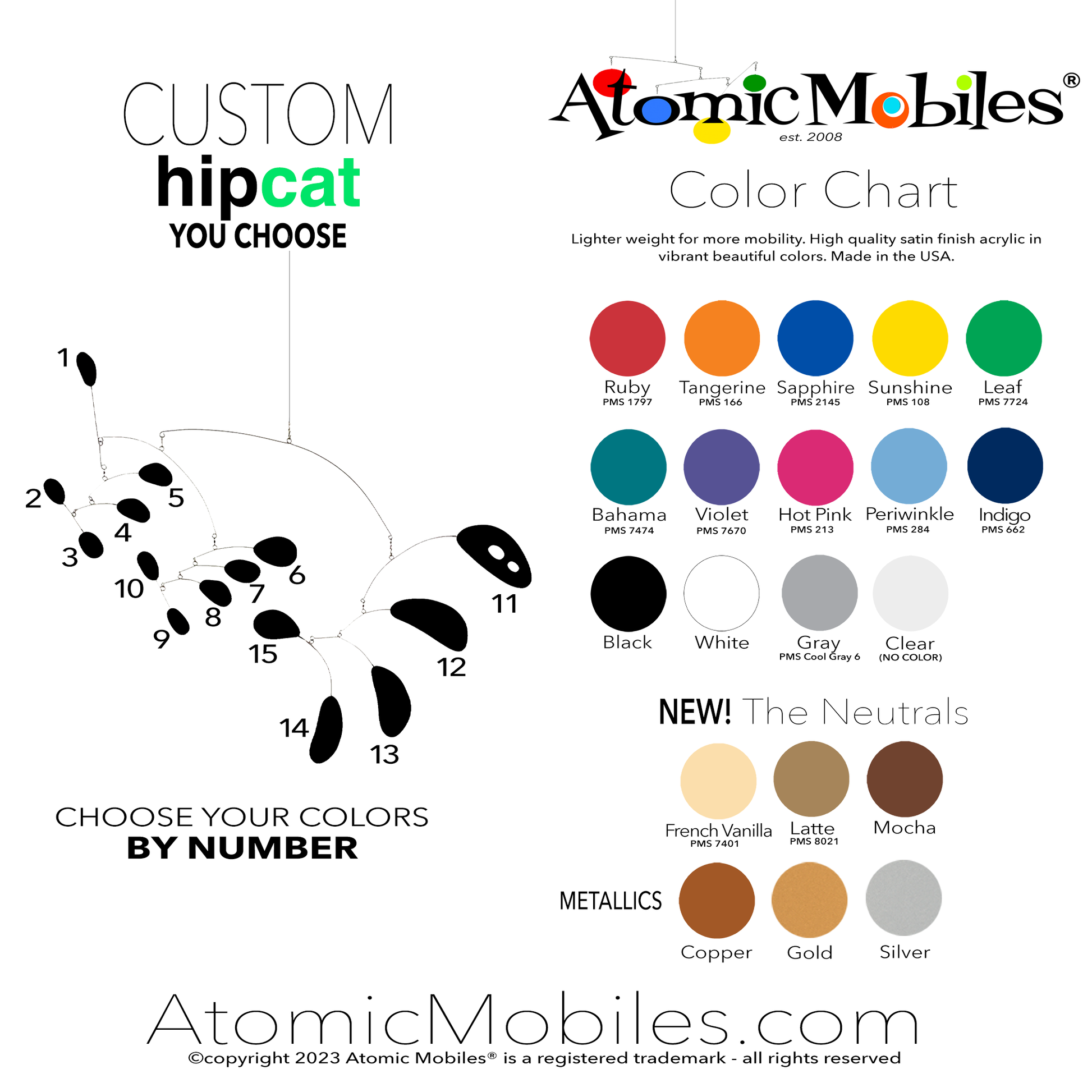 "HipCat" is a bold 1970s inspired modern art mobile, featuring large delightful free-form shapes. Mod! Available in a wide variety of sizes, perfect for just about any ceiling height.