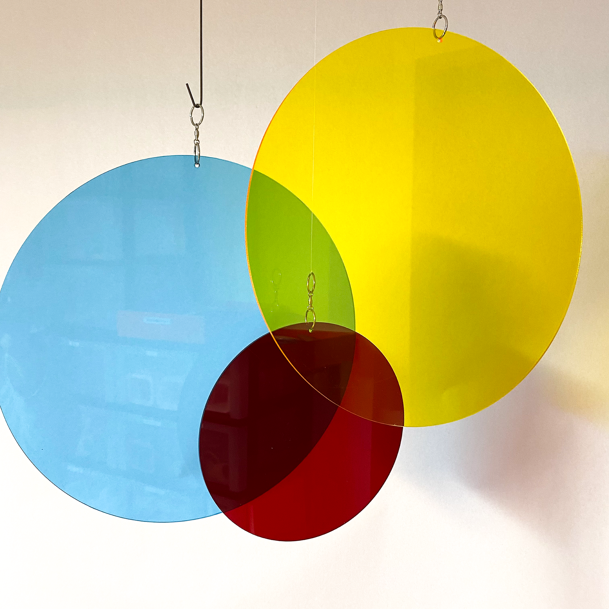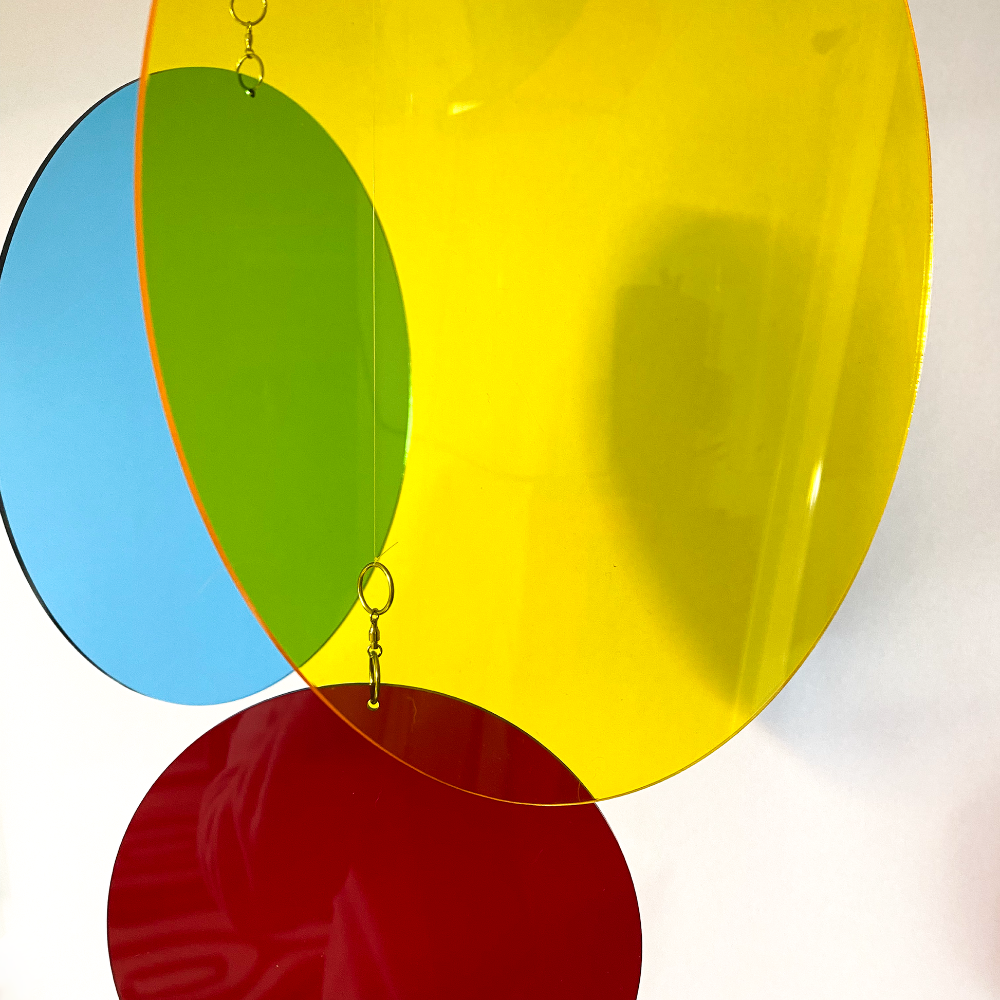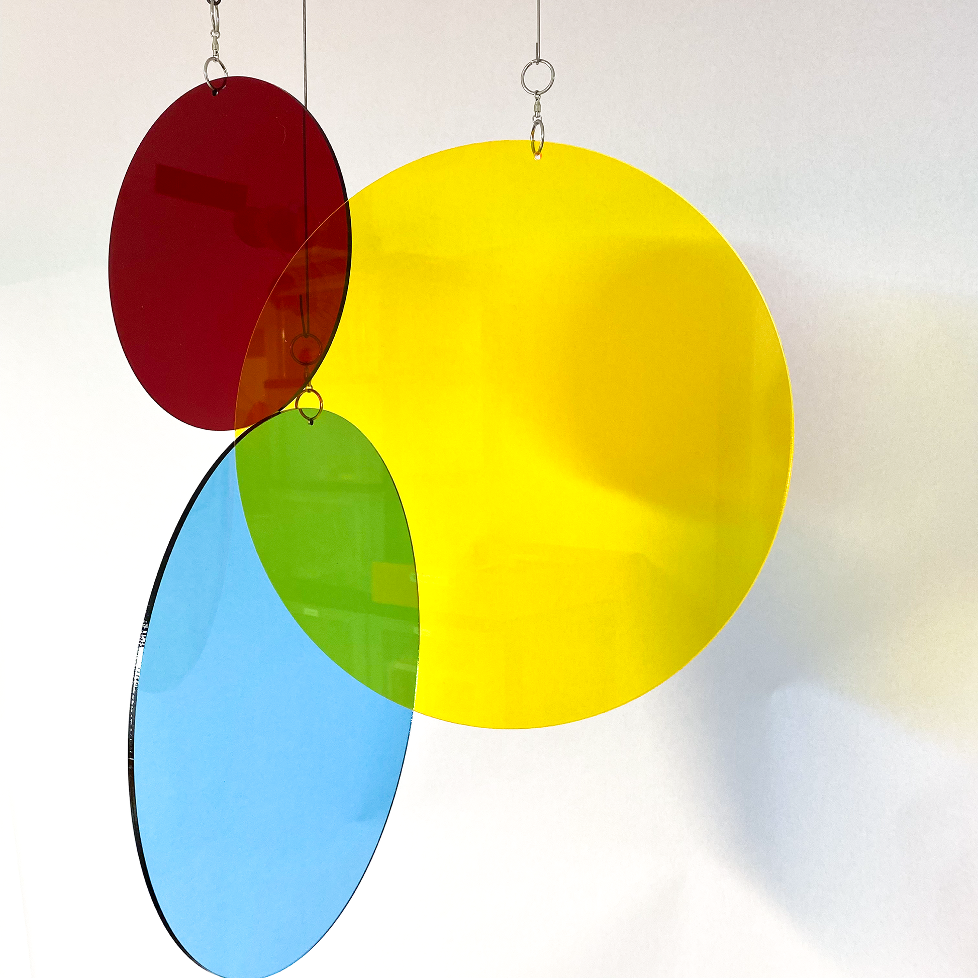 Bring out your Superstar Sunshine with this unique kinetic mobile art installation. You arrange the 3 delightfully bright colorful circles any way you wish -- each hangs separately -- for a one-of-a-kind art display. Hang in a window for dramatic reflections or anywhere you need a pop of color. Nicely priced too, combine horizontal and vertical sets for a sensational piece.